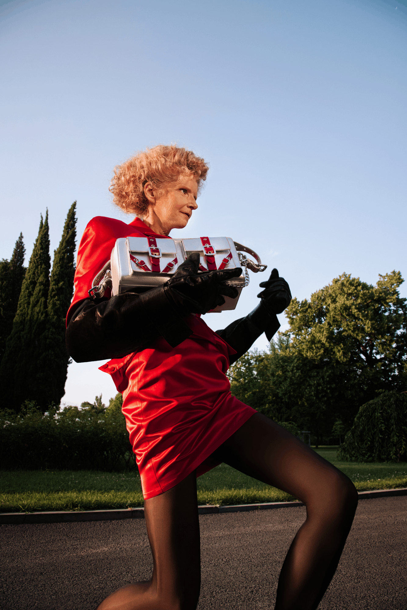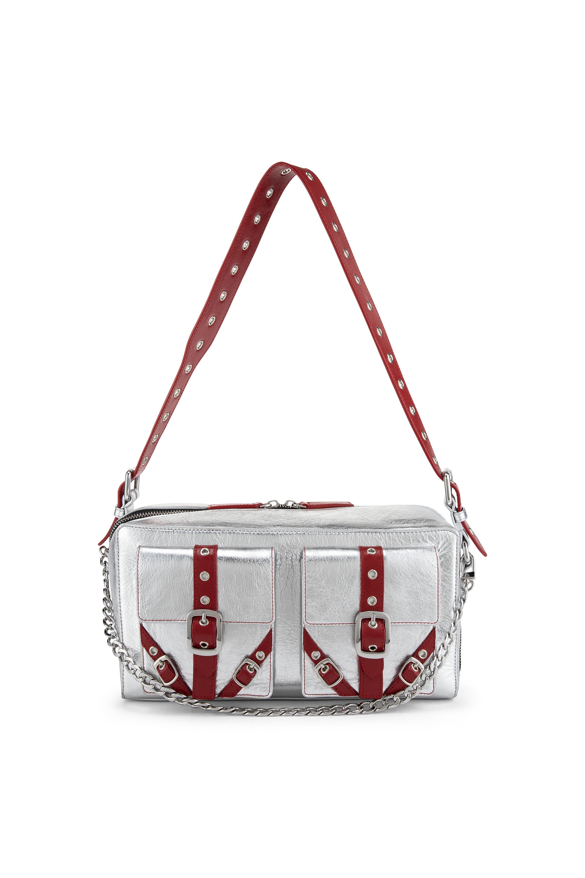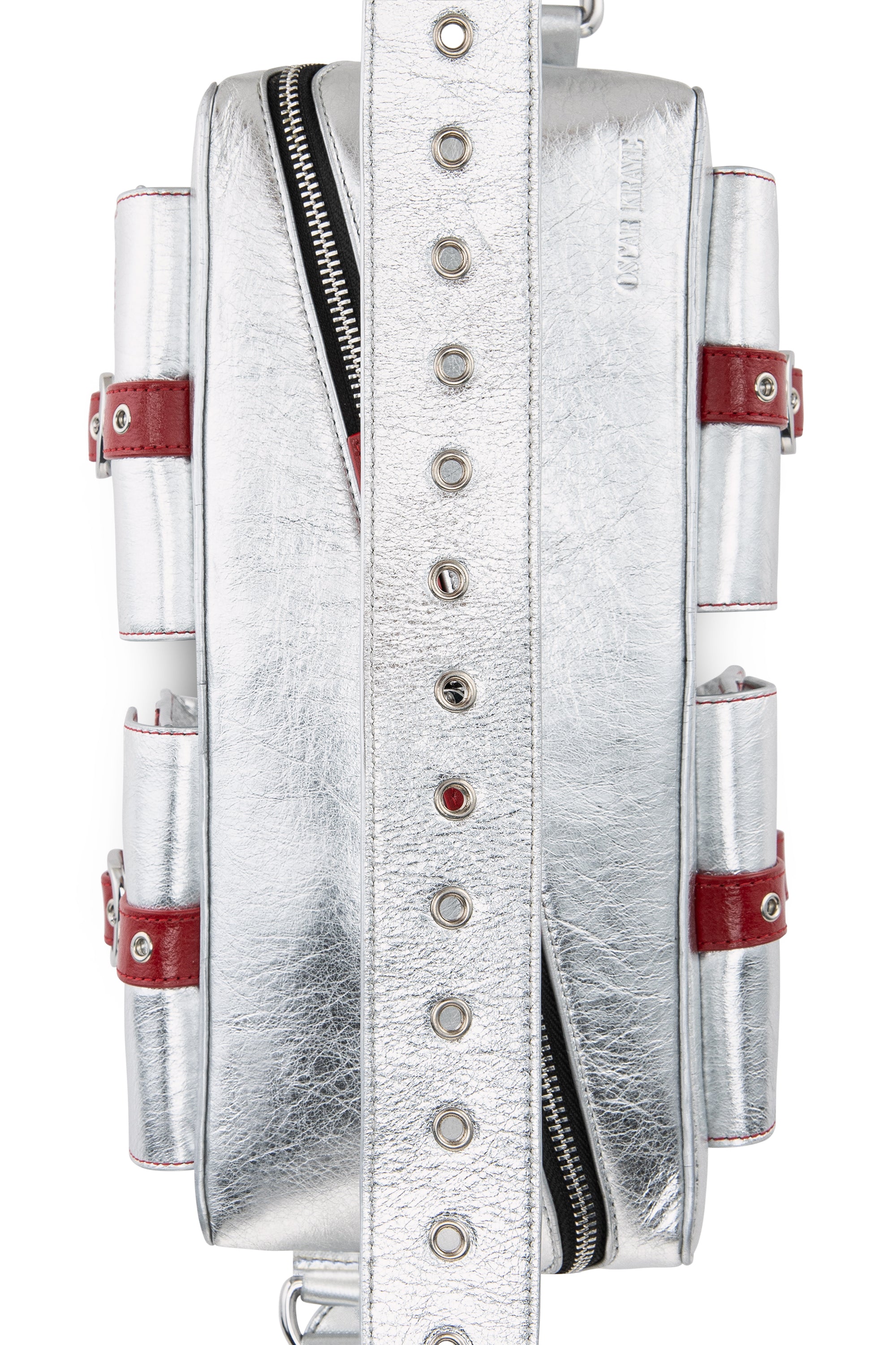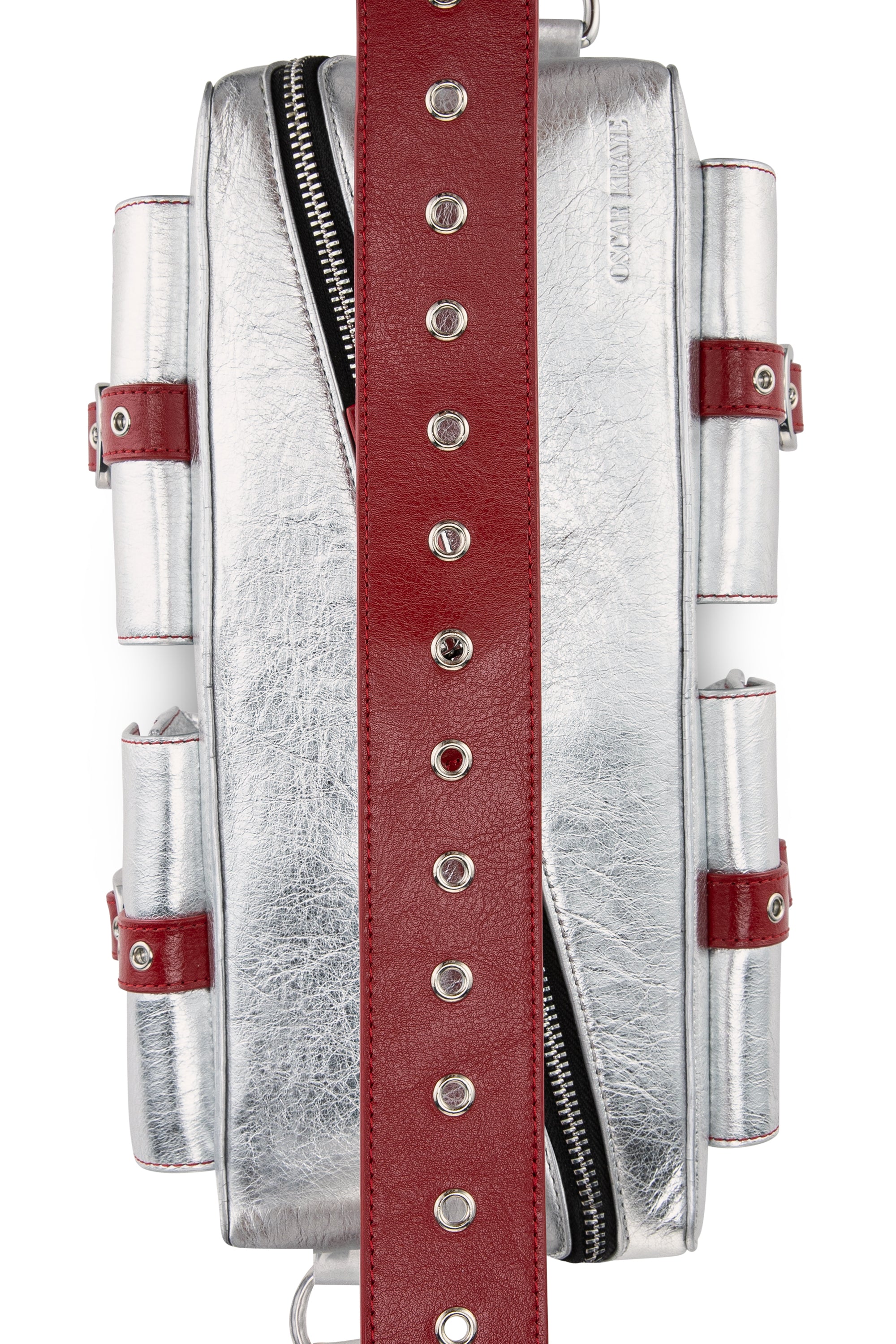 This special edition includes two interchangeable straps in silver and red, allowing the bag to shift seamlessly between styles.